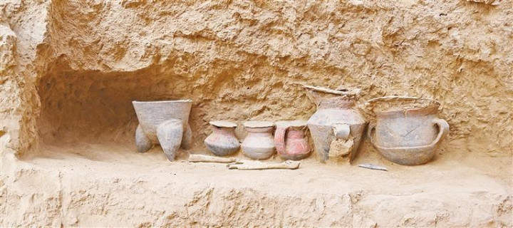 这是陕西榆林石峁遗址墓葬M13壁龛器物(资料照片)。